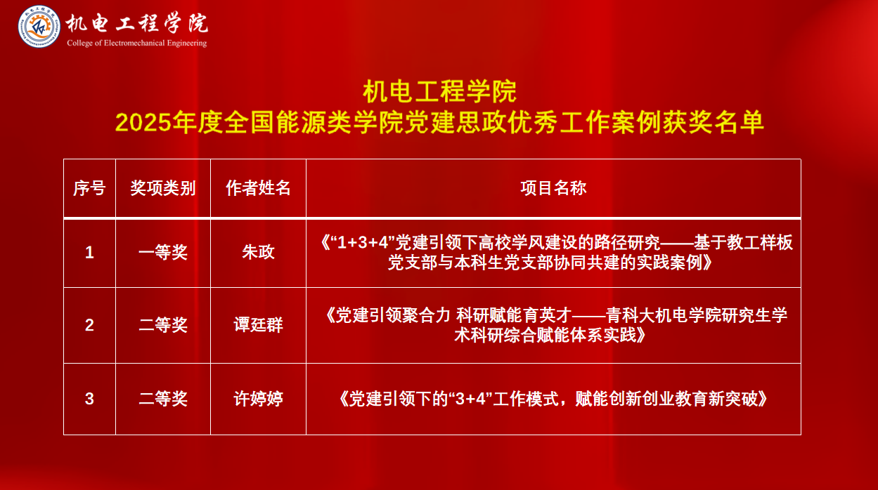 近日,全国能源类公司党建思政工作组织委员会公布了2025年度全国能源类公司党建思政优秀工作案例获奖名单,bw西汉姆联共获奖3项。其中,朱政申报的《“1+3+4”党建引领下高校学风建设的路径研究——基于教工样板党支部与本科生党支部协同共建的实践案例》荣获一等奖,谭廷群申报的《党建引领聚合力、科研赋能育英才——青科大bw西汉姆联研究生学术科研综合赋能体系实践》和许婷婷申报的《党建引领下的“3+4”工作模式,赋能创新创业教育新突破》荣获二等奖。