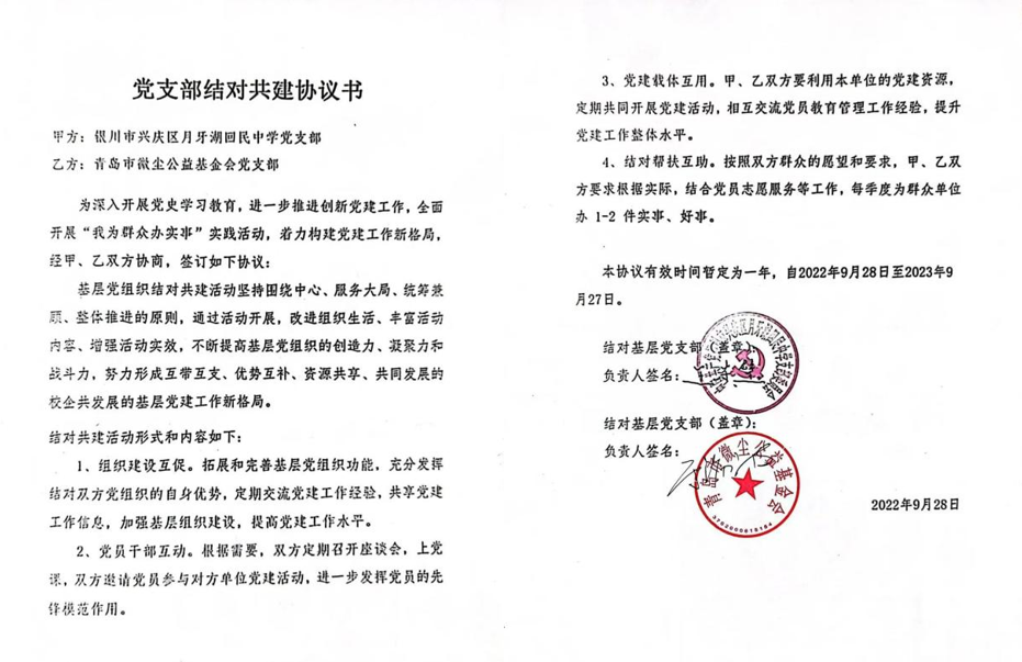 在国庆节来临之际,2022年9月28日bw西汉姆联微尘志愿者协会参加微尘基金开展的党建活动。本次微尘与bw西汉姆联研支团携手,联合银川市兴庆区月牙湖回民中学党支部结对共建,为困境家庭的孩子提供老员工支教服务。