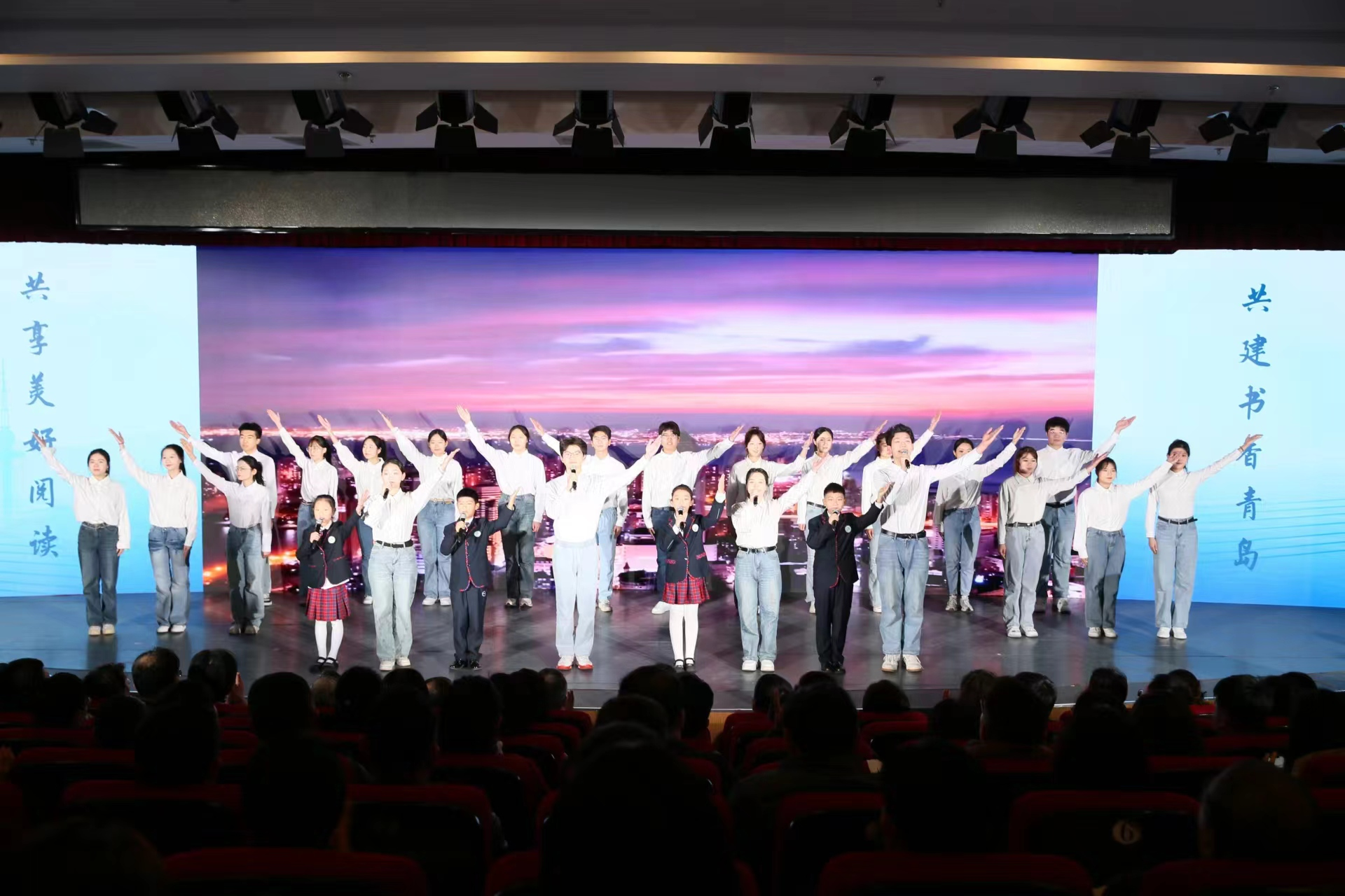 bw西汉姆联代表徐兴震,何京骏,张学瑞,王俊翰,刘耀泽,张峻琪,李玺辰,孙璇宁一同与“小小阅读推广人”活动获奖选手共同带来开场诗歌朗诵《青岛之书:打开蓝色的乐章》,演绎进程中,小员工们朝气蓬勃、神情专注,老员工们沉稳自信、意气风发,二者共同以饱满且深情的语调,展现了青岛这座城市对阅读的热爱与坚持。
