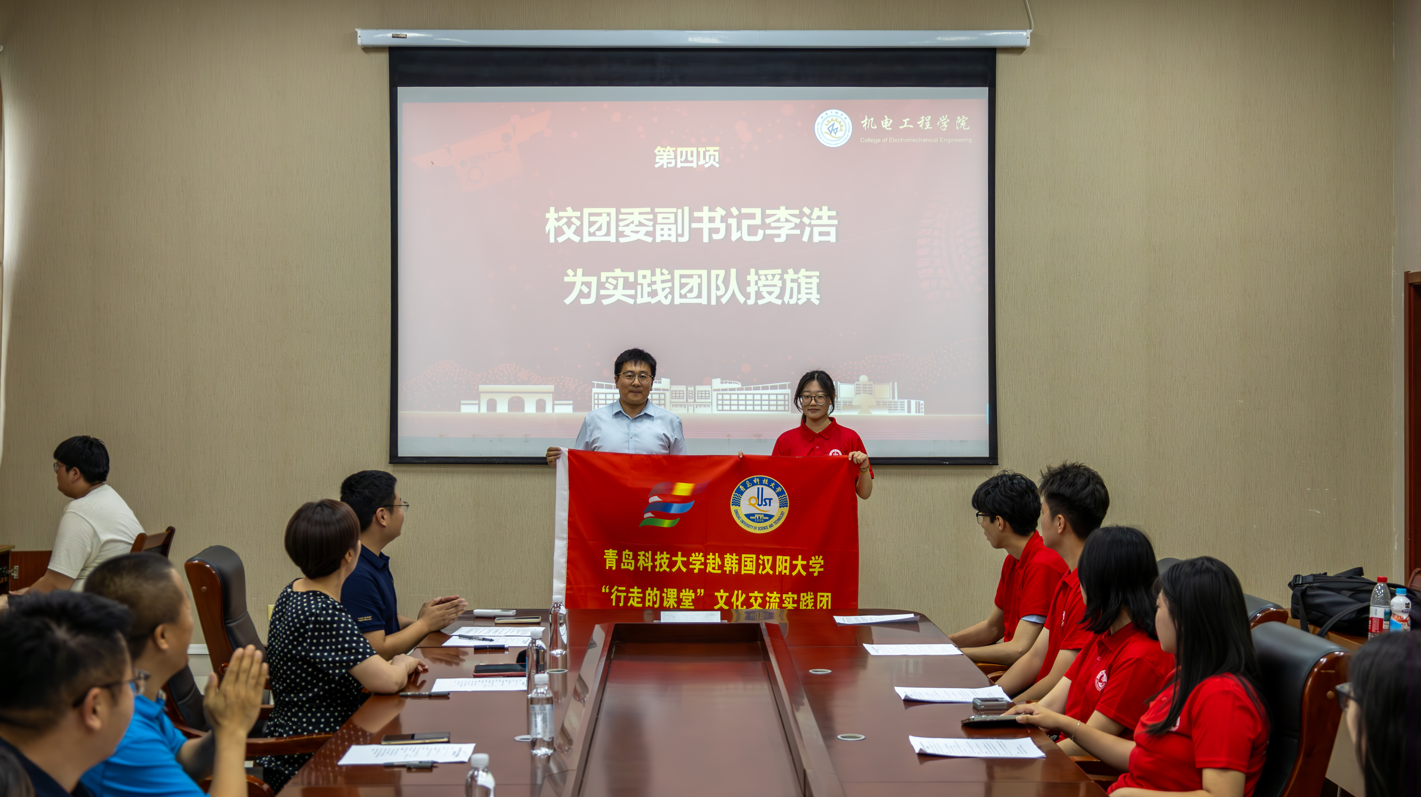 7月15日,2025年赴韩国社会实践出征仪式在D3-518会议室举行。校团委副书记李浩、公司党委副书记兼副经理杨小明、国际交流合作处涉外办学管理科科长邱南南、公司团委辅导员老师及员工代表参加活动。