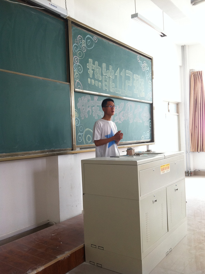 班会由班长王备同学主持。首先,由课代表以及学习委员向同学们介绍考试需要注意的问题。机械制图课代表郭瑞涛建议大家根据考点进行复习,并给大家画出了考试的重点部分;物理课代表袁世魁强调了物理练习册的重要性,并建议大家认真记公式、多做练习题;线性代数课代表颜艳以往年的试题为例子,建议大家注重概念的理解、多读课本、多做题,并总结往年试题的题型;英语课代表赵雨兰则从单词、作文、听力等方面向大家介绍了学英语的方法;最后学习委员向大家介绍了复习高数的方法,并总结了课代表们介绍的方法,安排了我们班级最近的学习以及考试计划。最后,辅导员老师秦洪庆总结讲话。秦老师首先强调了考风考纪方面的问题,用一些实例说明了违反考风考纪的严重后果,并希望同学们将上学期的良好表现继续延续下去;接着,秦老师从老员工活方面谈了他的看法,并让我们想一想我们刚进大学时的理想,想一想父母对我们的期望,想一想自己逝去的这一年的青春,要求我们摆正心态,树立好目标;最后,秦老师建议大家提高自学能力,并向大家介绍了往年考试的经验,要求大家不仅要做往年的试题,还要及时的总结。班会接近尾声,秦老师祝大家都能取得好成绩。
