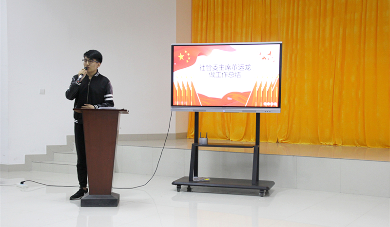 活动首先进行颁奖环节,王梦玉、姚良振等获评一等奖,孙健、张楚等获评二等奖,刁 旭、刘耀珍等获评优秀干事,微尘志愿者协会、心理健康协会、青尘义工队获评优秀部门,社管委秘书处、新媒体获评突出贡献部门。社管委主席董运龙和社管委秘书长李洋分别为获奖同学和优秀干事颁发证书和奖品,分团委逄柏鹏老师为获奖部门颁发了荣誉证书,并告诫同学们以他们为榜样努力奋斗。随后董运龙上台进行了工作总结,最后由逄老师发表讲话,肯定各协会半学期以来的工作,同时也指出工作和活动中不足,进一步确立社管委工作方向。到此表彰大会圆满结束。