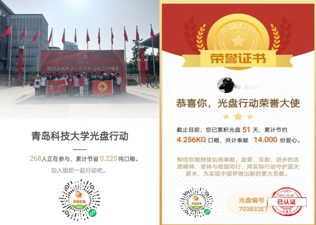 自2021年10月16日推出“光盘行动,你我同行一一30天打卡活动”以来,至今已近半月,实现“光盘打卡”5926次,相当于节约了约0.225吨粮食。此次活动积极响应了在本次世界粮食日,联合国粮食及农业组织的呼吁:政府、国际组织、高校等社会各界需凝聚共识,采取行动,改变世界粮食生产和消费方式。