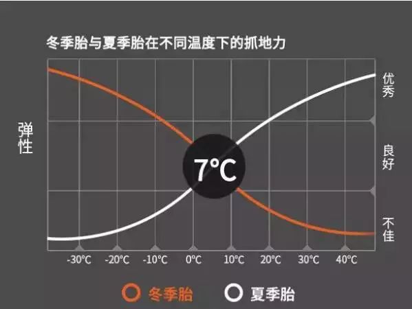 冬季轮胎和夏季轮胎的区别主要在于胎面橡胶配方不同,冬季轮胎的配方可使橡胶在低温下保持弹性。试验验证,在7℃左右,冬季轮胎和夏季轮胎具有接近的弹性。所以欧盟很多国家规定,更换冬季轮胎的时间点以低温低于7℃为准。