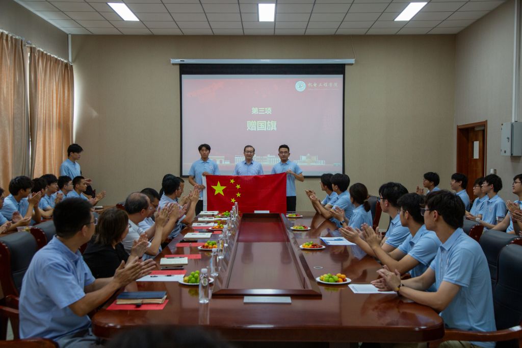 会上,任允晓为职工代表赠予国旗,与会领导为全体赴韩同学颁发“动力礼包”,出国职工代表杨桐发言,表达了赴韩留学的初心使命、铿锵誓言。
